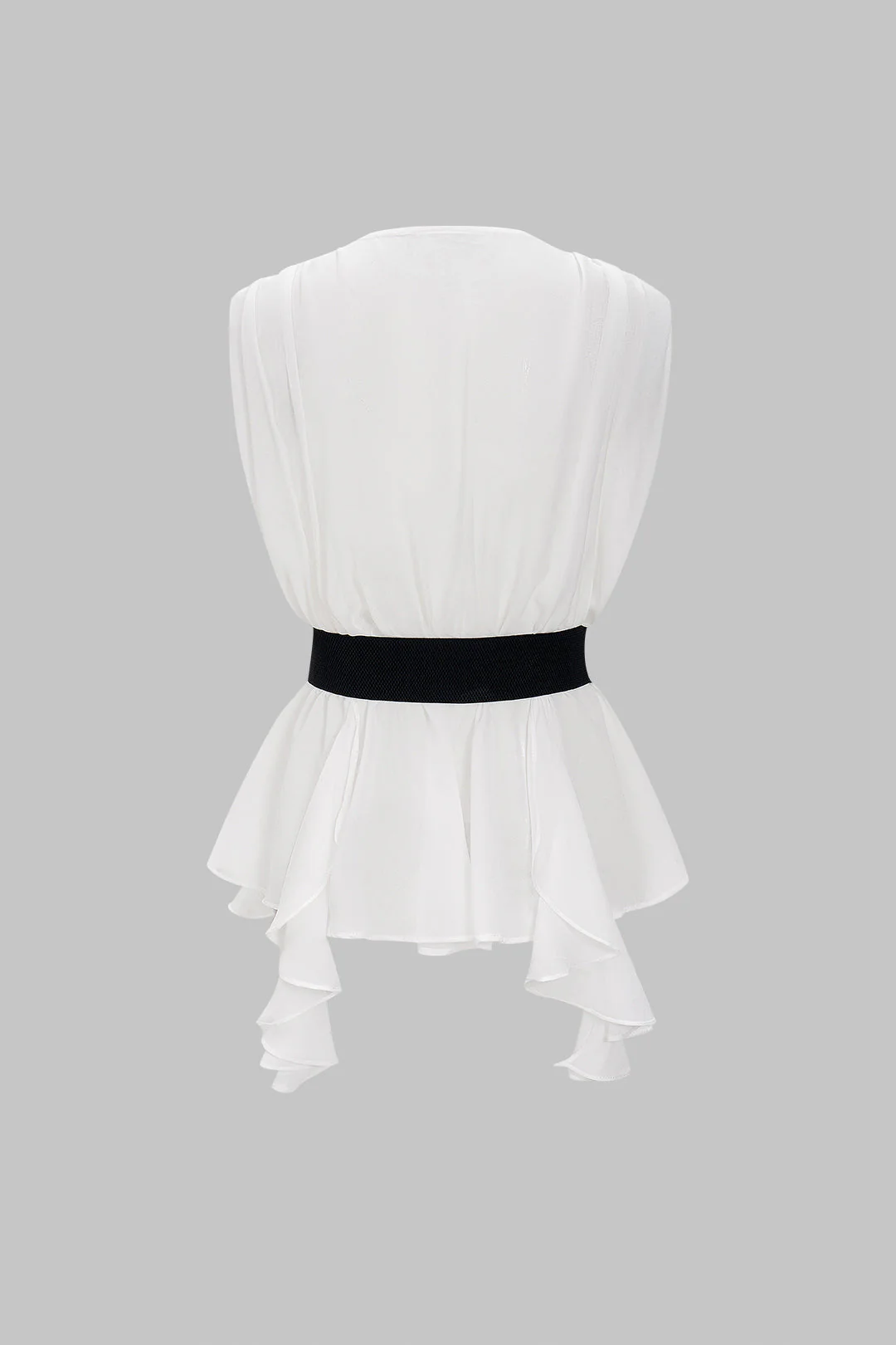 Zebra Stripe Print V-Neck Belted Short-Sleeve Shirt