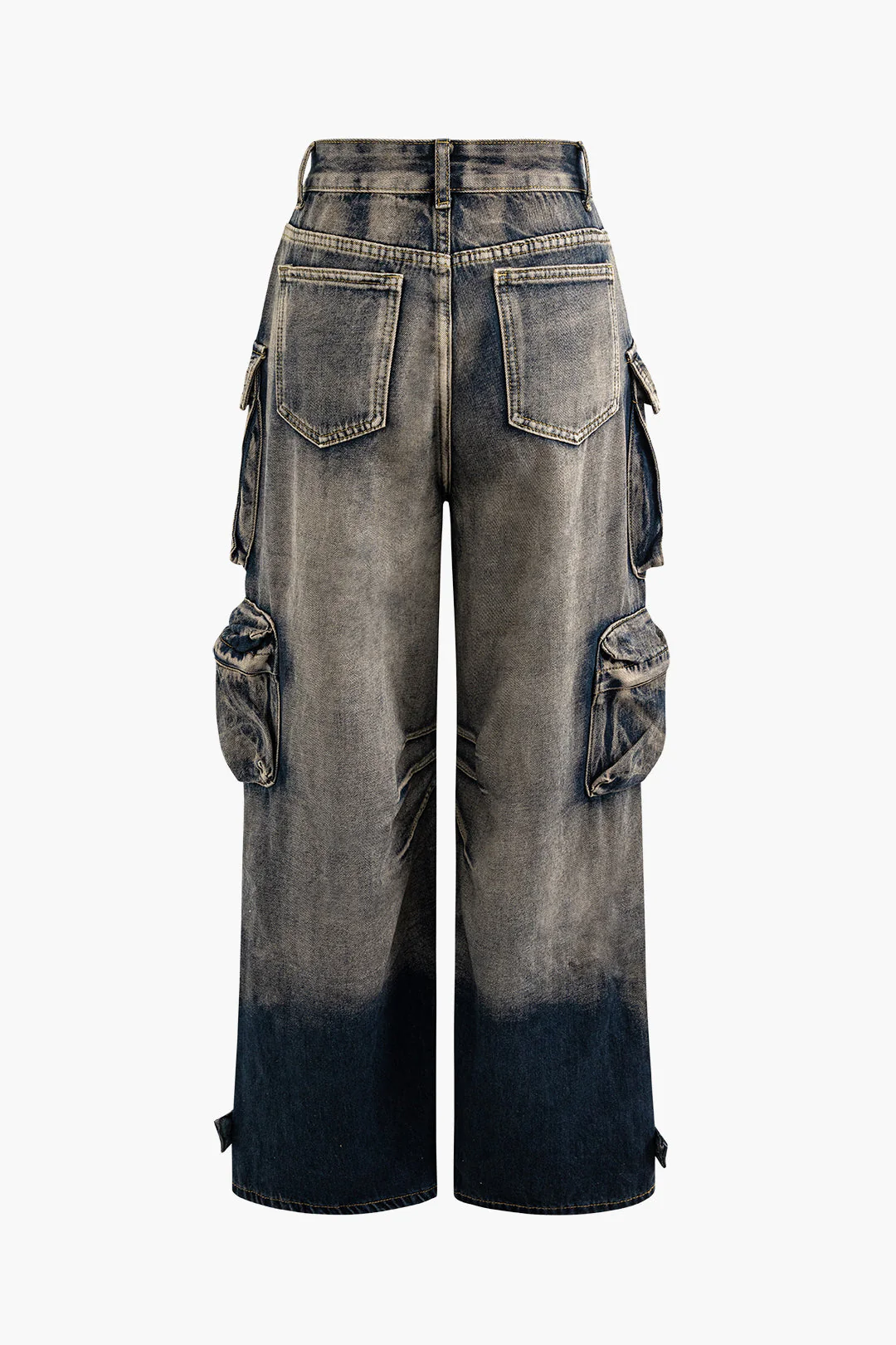 Ombre Punk Wide Leg Cargo Jeans with Multi Pockets