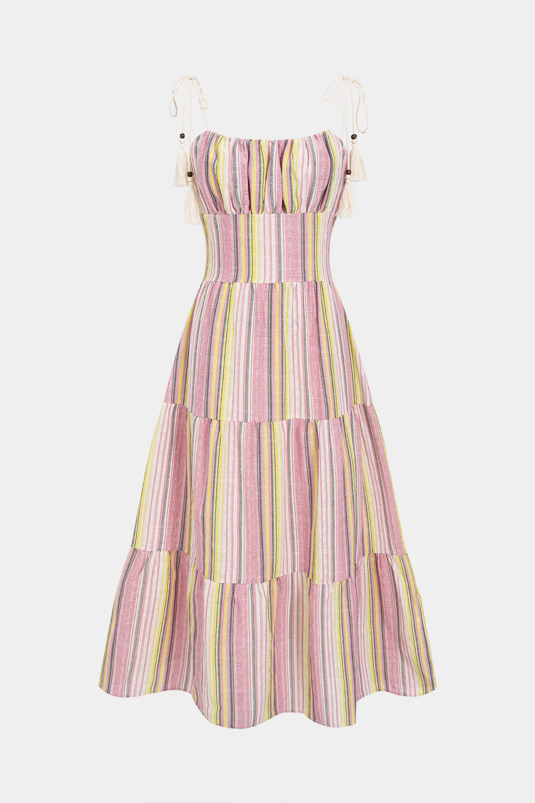 Retro Stripes Print Ruched Patchwork Slip Sleeveless Maxi Dress