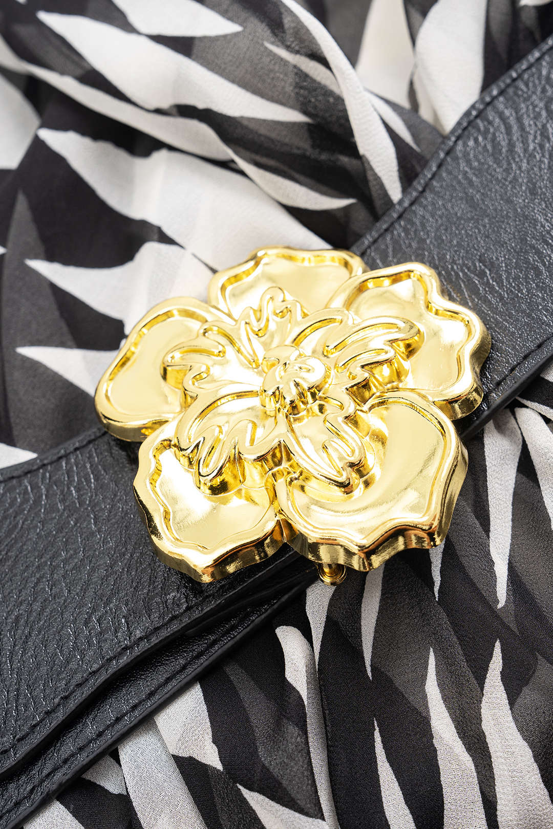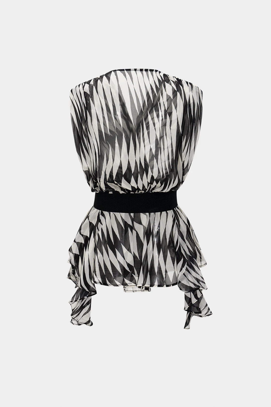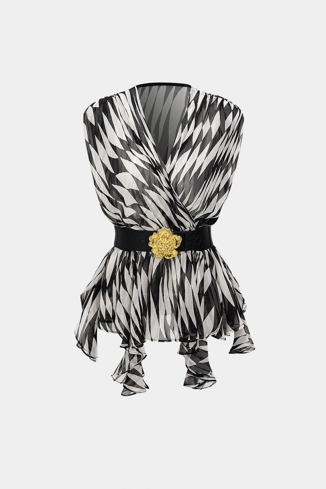 Zebra Stripe Print V-Neck Belted Short-Sleeve Shirt