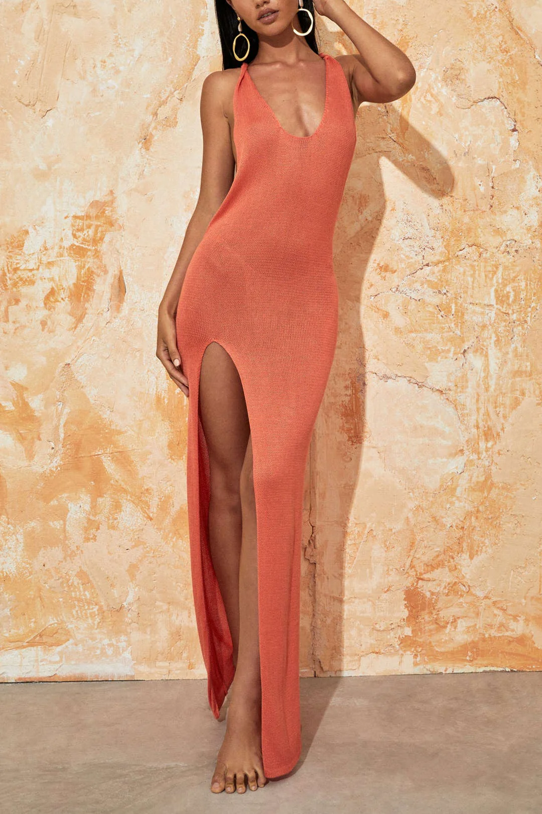 Tie Halter Backless Slit Crochet Knit Midi Dress